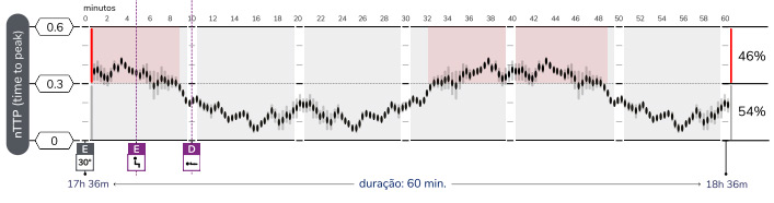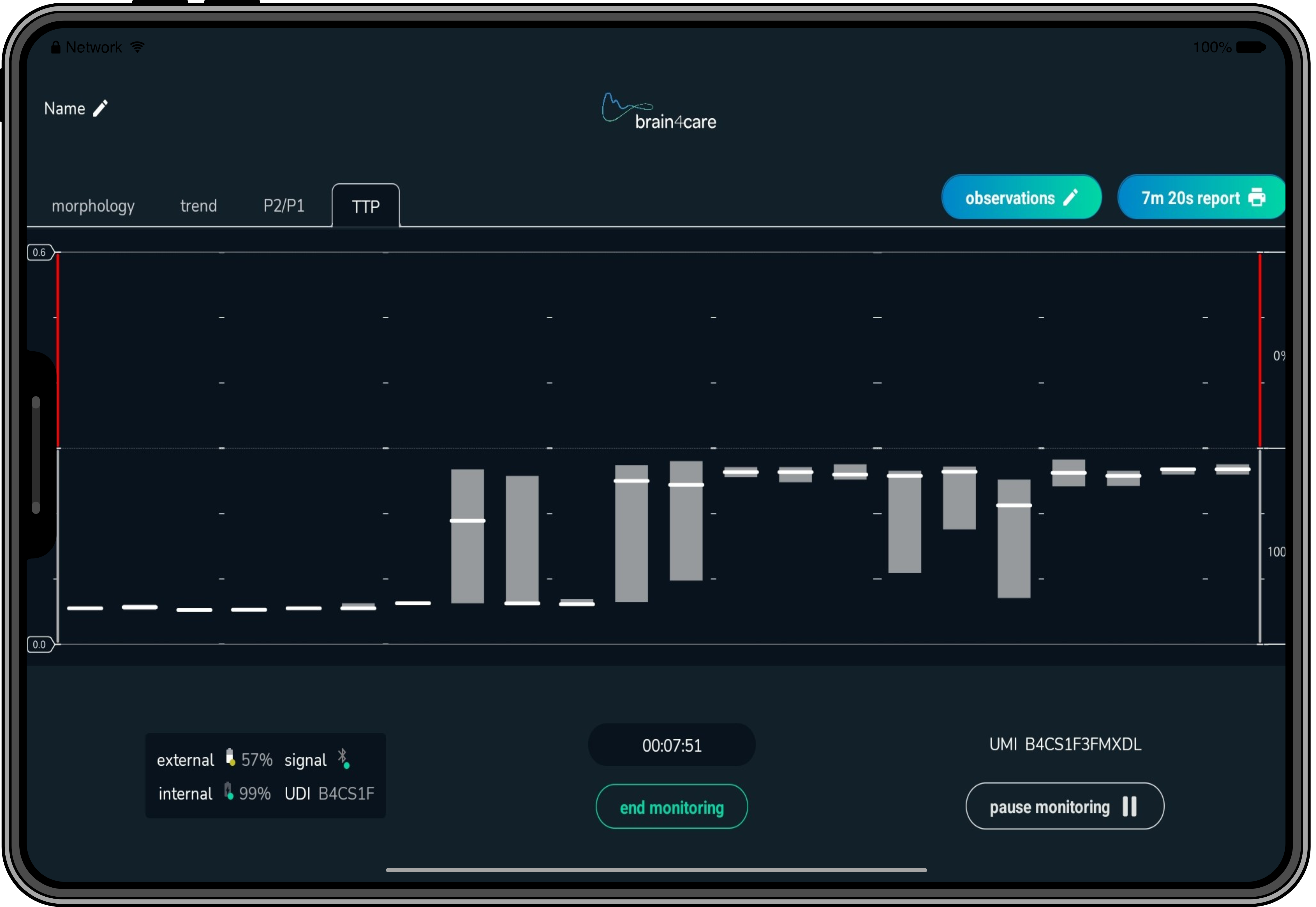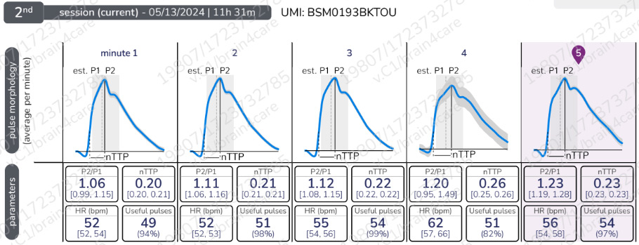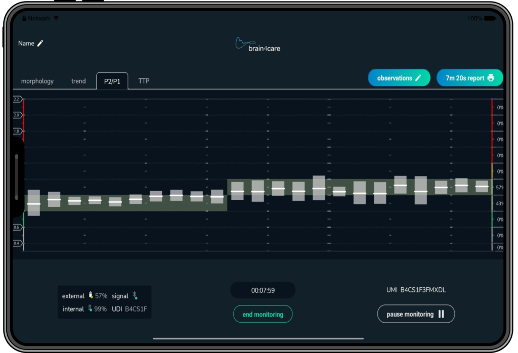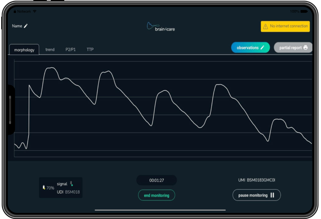 The live surrogate ICP waveform shows intracranial dynamics, the interplay between intracranial pressure and compliance.