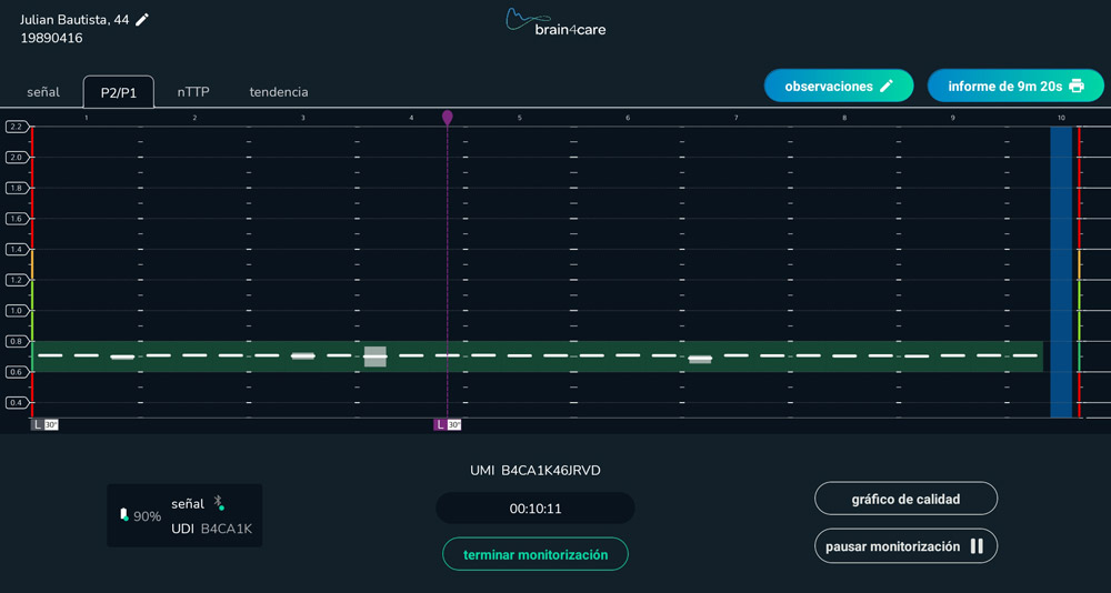 - P2/P1 > 1,4: 90 % de especificidad para evaluar el riesgo de hipertensión intracraneal (HI)*