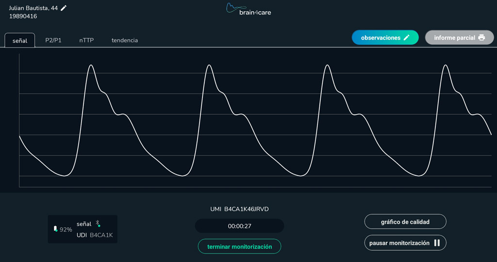 la forma de onda de PIC sustituta en vivo muestra la dinámica intracraneal, la interacción entre la presión intracraneal y la distensibilidad.